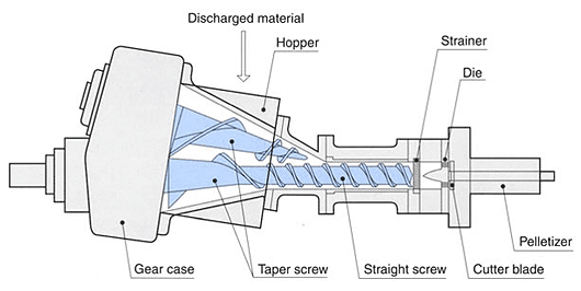Just discharge directly from your mixer into the open top hopper to stramline your manufacturing operation. Extruding materials at higher pressure than 2TE it is used for pellet production and pre-shaping process operation.