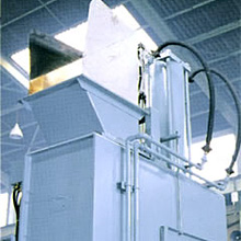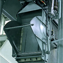 A fan-shaped damper chute at the rear side material supply port of DX models incorporates both conveyor and bucket (as illustrated) to automatically supply the necessary amount of material calculated for each process. This design is particularly helpful in automated production lines.