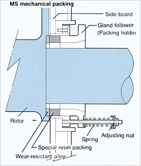 The MS mechanical packing between the rotor and mixing chamber, which serves to prevent leakage and enhance overall durability, is easy to replace and maintain.- The rotor surface which contacts the mixed material is made of a wear-resistant alloy. A special resin packing is also used to improve overall durability and prevent leakage.